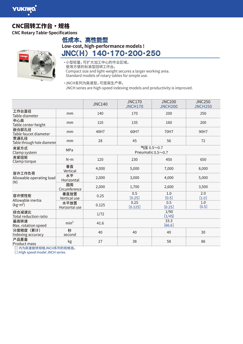 YUKIWA 低成本、高性能型 JNC(H) 140•170•200•250